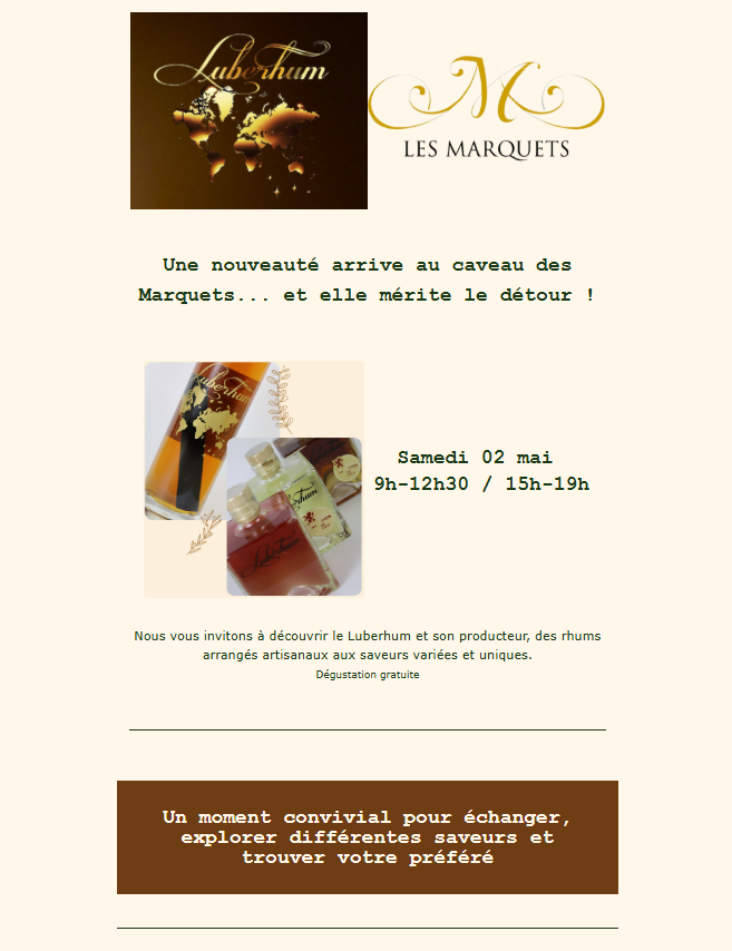 Le samedi 20 Décembre 2025, venez partager un moment festif chez Les Marquets. Au programme : Dégustation de vins et de Champagne de la Maison COLLET accompagnée d'une dégustation de fruits de mer par MC traiteur. Seront également présents pour vous accueillir et vous faire découvrir des produits locaux, La Madelaine Coquette, Les Plantourians,